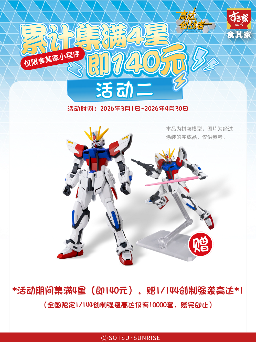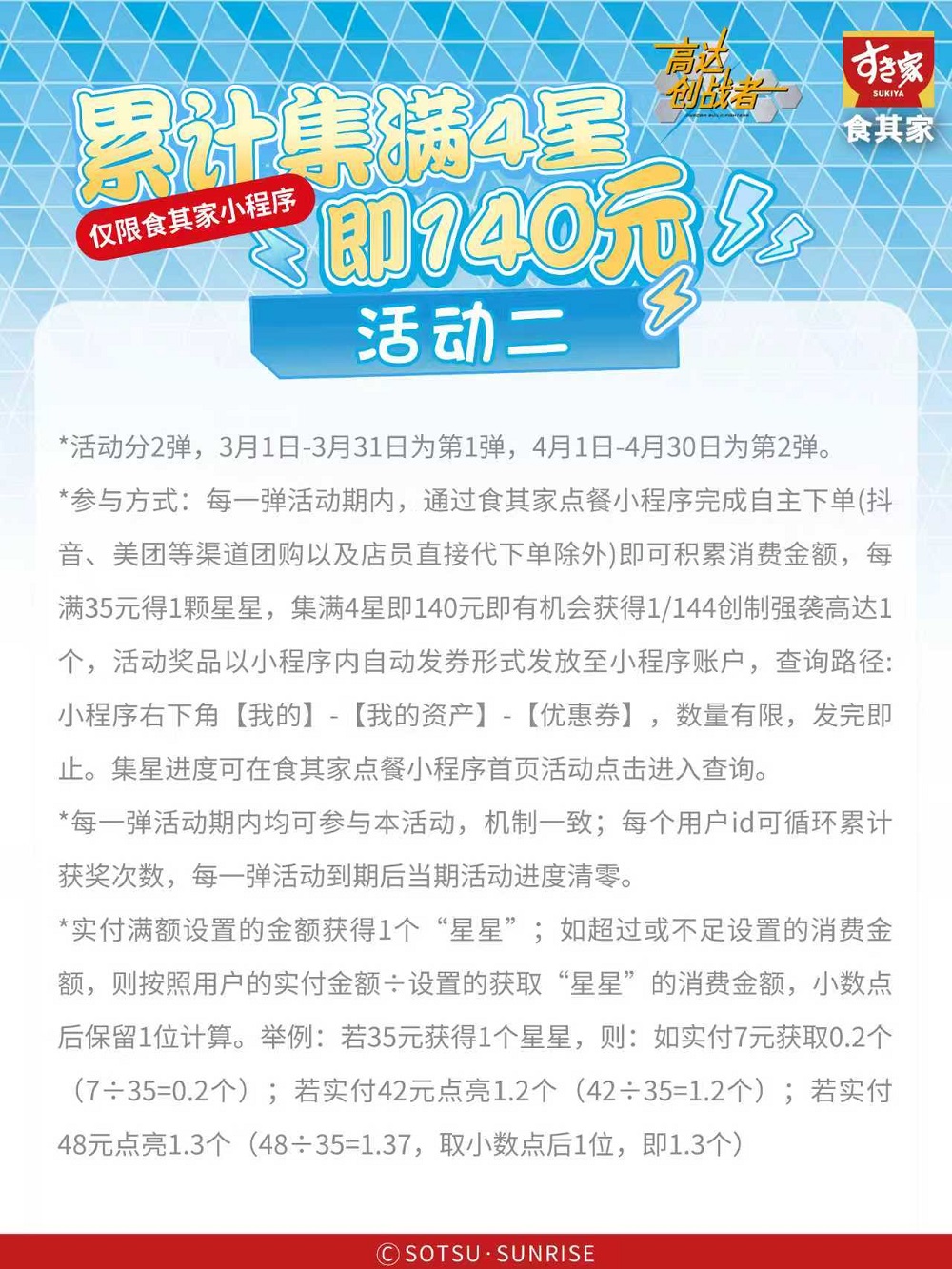 *参与方式:每一弹活动期内,通过食其家点餐小程序完成自主下单(抖音、美团等渠道团购以及店员直接代下单除外)即可积累消费金额,每满35元得1颗星星,集满4星即140元即有机会获得1/144创制强袭高达1个,活动奖品以小程序内自动发券形式发放至小程序账户,查询路径:小程序右下角【我的】-【我的资产】-【优惠券】,数量有限,发完即止。集星进度可在食其家点餐小程序首页活动点击进入查询。