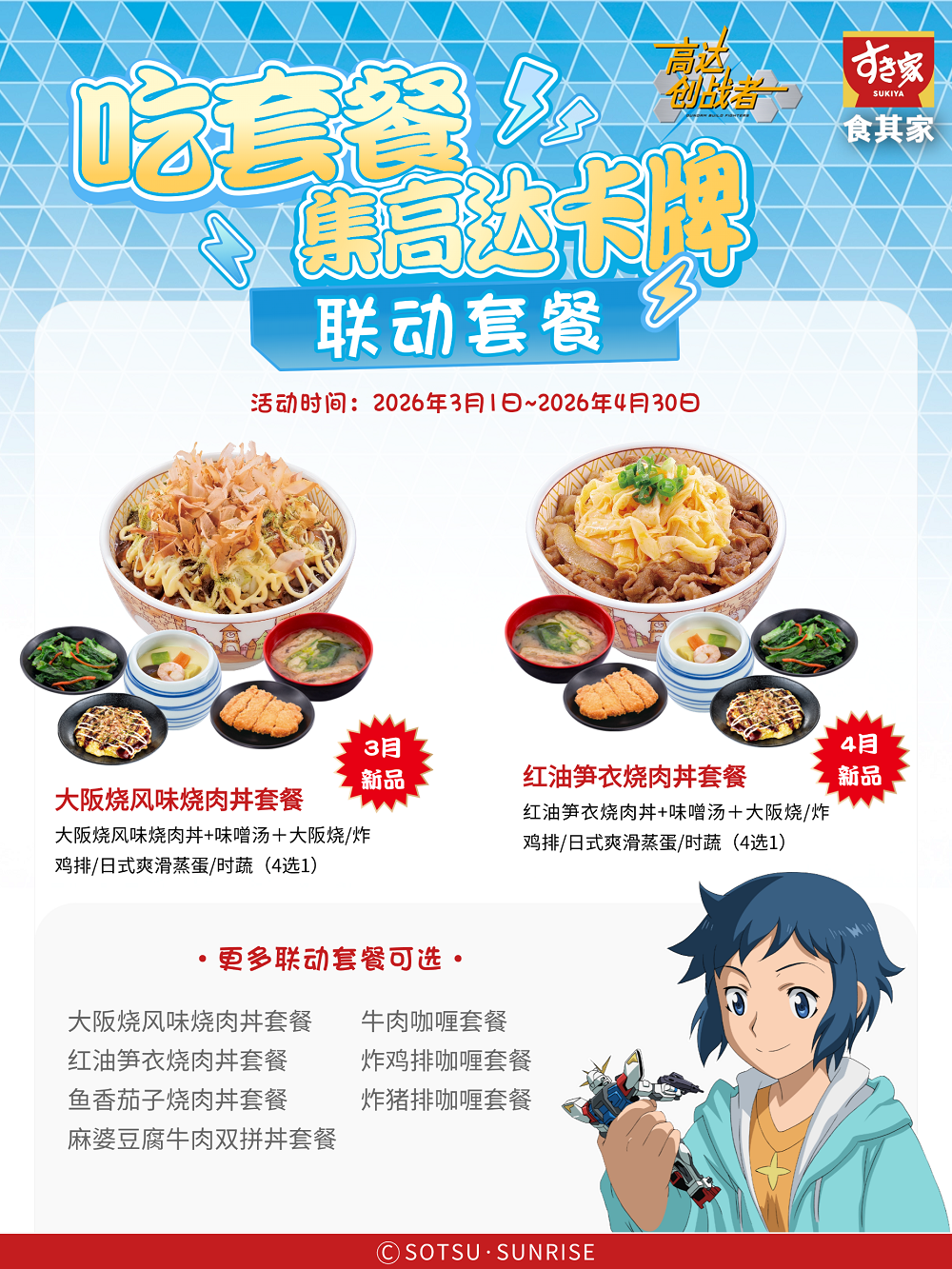 大阪烧风味牛丼+味噌汤+大阪烧/炸鸡排/日式爽滑蒸蛋/时蔬(4选1)